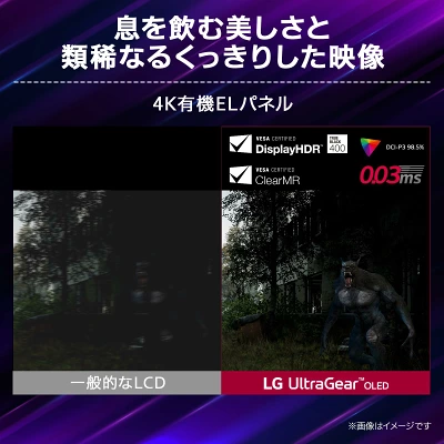 「32GS95UV-B」は、有機EL採用の31.5型ハイスペックモデル。解像度は4Kで、150万:1の圧倒的なコントラスト比を誇り、液晶を凌駕する鮮烈なビジュアル体験を実現します。