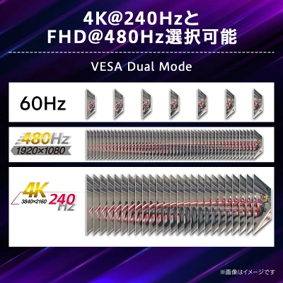 デュアルモードを搭載するため、4K/240Hzリフレッシュレート、フルHD/480Hzリフレッシュレートを状況に応じて切り替えられます。