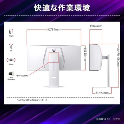 「34GX90SA-W」は、有機ELを搭載した34インチの湾曲ウルトラワイドモニター。アスペクト比は21:9、解像度はUWQHDで、迫力満点のゲームや映画を楽しめることが特徴です。