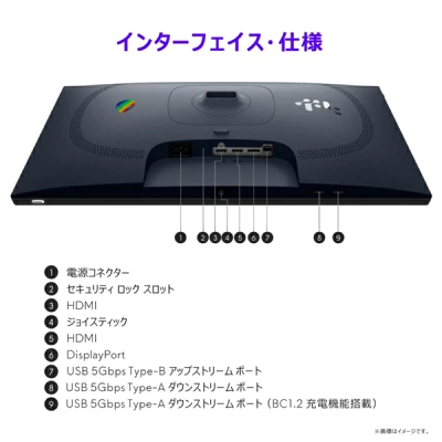 接続端子としては、DisplayPort 1.4を1基、HDMIを2基搭載しており、PC・ゲーム機・映像機器などさまざまなデバイスと接続可能です。