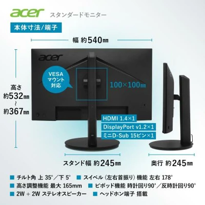| 接続 | HDMI、DP、ミニD-Sub 3.5mmステレオミニジャック |