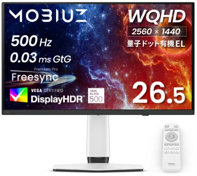 26.5インチ・WQHD・有機EL・0.03ms・500Hzという組み合わせは、今の27インチ前後のゲーミングモニターでもかなり強い部類に入ります。一般的な180Hzや240Hzクラスから見ると、完全に別枠のハイエンドです。