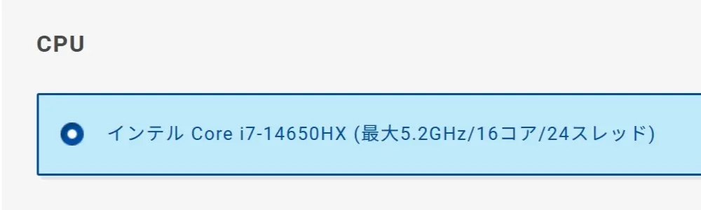 Core i7-14650HXは、第14世代Core i7の中でもパフォーマンス寄りの上位モデルで、最大5.2GHz動作・16コア24スレッドという構成が特徴です。