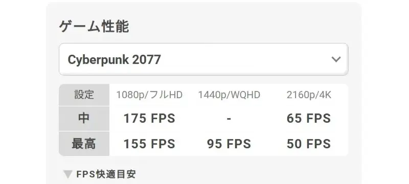 Cyberpunk 2077のような重量級タイトルでも、WQHDで90fps以上と非常に滑らか。しかし、4Kでは50fps前後に下がる見込みのため、WQHDまでが現実的な範囲といえます。