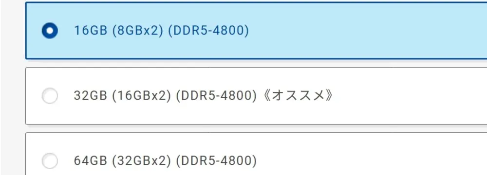 16GBでは対応しきれない場面も出てくるため、将来的な拡張を見越して最初から増設しておくと安心です。