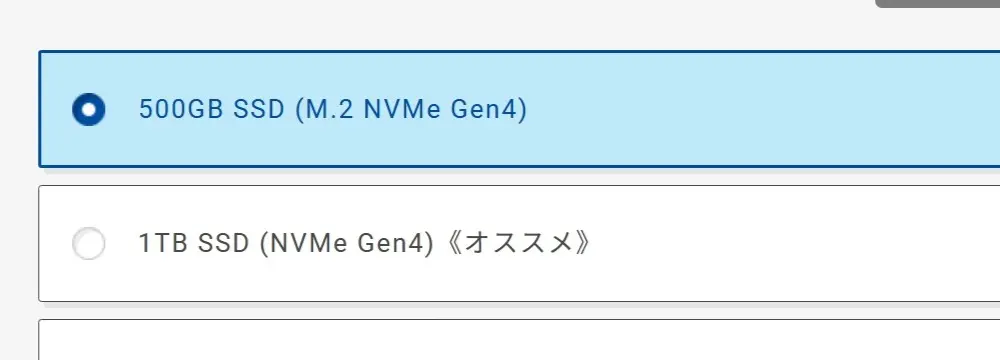 ストレージは、現状のカスタマイズで1TB SSDや2TB HDDを1万円以下で追加可能です。