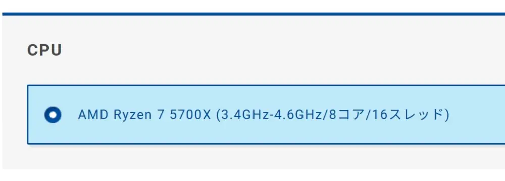 まず注目したいのはCPUの選択肢です。Ryzen 7 5700X・7700・7800X3Dの3種類が用意されており、用途や予算に合わせて選択可能。