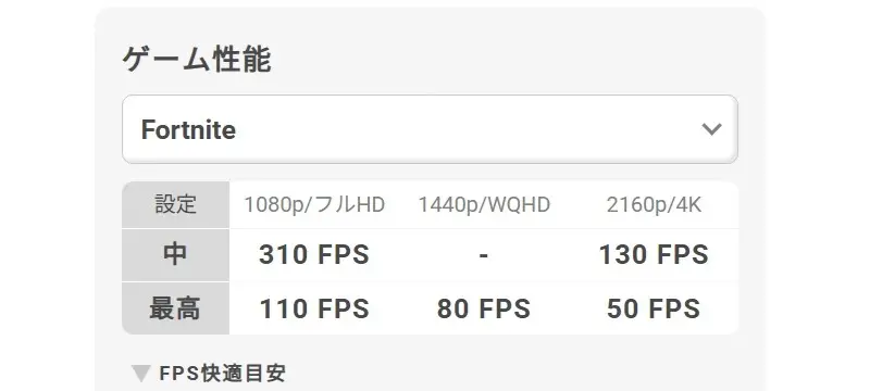 ただし、FortniteをWQHDでプレイする場合は80fps、4Kではおおよそ50fpsまで低下する見込みであることから、WQHDまでの解像度が現実的な選択肢といえるでしょう。
