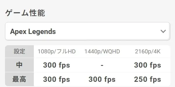 Apexのような中量級タイトルでは、3モデルともかなり余裕があります。フルHDやWQHDでは300fps級が見えてくるので、正直このクラスのPCだと性能を持て余しやすいです。