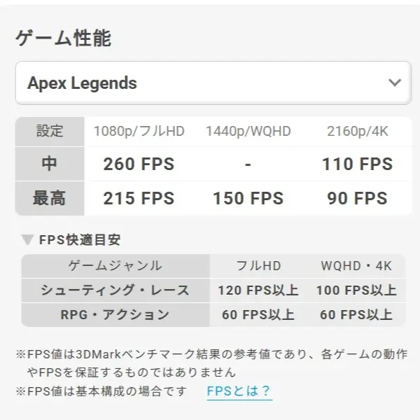 ドスパラ公式サイトでは、本モデルが人気ゲームでどれくらいのFPS(目安)が出るのかをタイトルごとに詳しく公開しています。