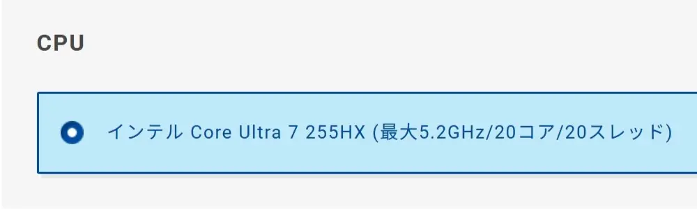 Core Ultra 7 255HXは最大5.2GHz動作、20コア/20スレッド構成を持つ、Core Ultra 7シリーズで上位クラスの高性能CPUです。