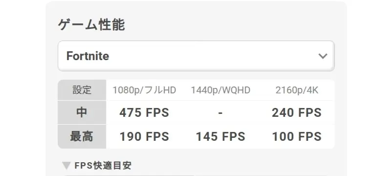 例えば、FortniteではフルHD・最高画質で190fps、WQHD環境で145fps、さらに4K解像度でも100fpsを記載。