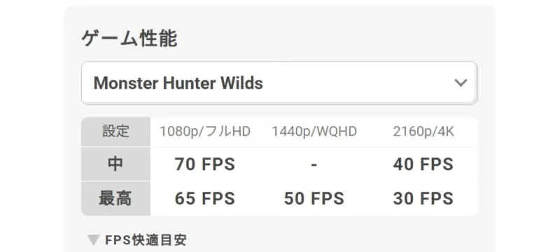 たとえば、負荷の大きい「モンスターハンターワイルズ」をフルHD・最高画質でプレイした場合、ノートPCとしては優秀な約65fpsを想定。
