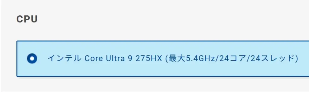 Core Ultra 9 275HX は、「Core Ultra」シリーズの中でも上位に位置するハイスペックCPUです。24コア/24スレッドという強力な構成により、ゲームはもちろん、多数のアプリを同時に動かすマルチタスク性能でも非常に優れています。