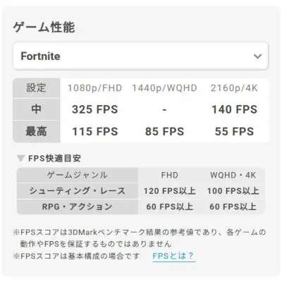 ドスパラの公式サイトでは、本モデルの各種人気タイトルにおけるフレームレートの目安が公開されています。
