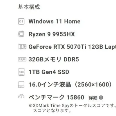 下位のRTX 5060搭載モデルと比較すると7万円の差があるため、そのスペックを十分に活かせる用途があるかどうかを見極めた上での購入がおすすめです。