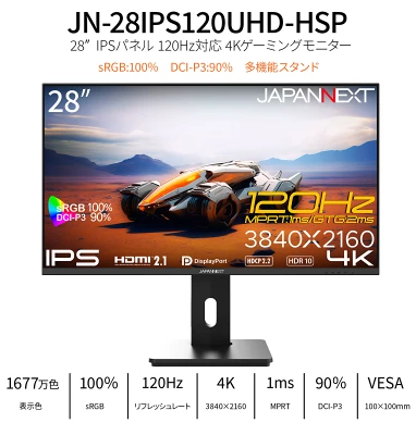 JAPANNEXT「JN-28IPS120UHD-HSP」は、4K解像度と120Hzリフレッシュレートを両立し、次世代ゲーム機やPCゲームを快適に楽しめる高性能ゲーミングモニターです。
