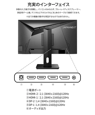 JN-28IPS120UHD-HSPは、HDMI2.1を2つ、DisplayPort1.4も2つ搭載しており、合計4台のデバイスを同時に接続できます。