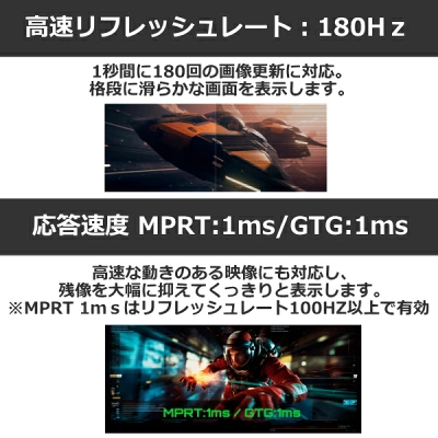 最大リフレッシュレートは180Hzで、通常の60Hzモニター比べ、3倍速で画面を書き換えることが可能です。