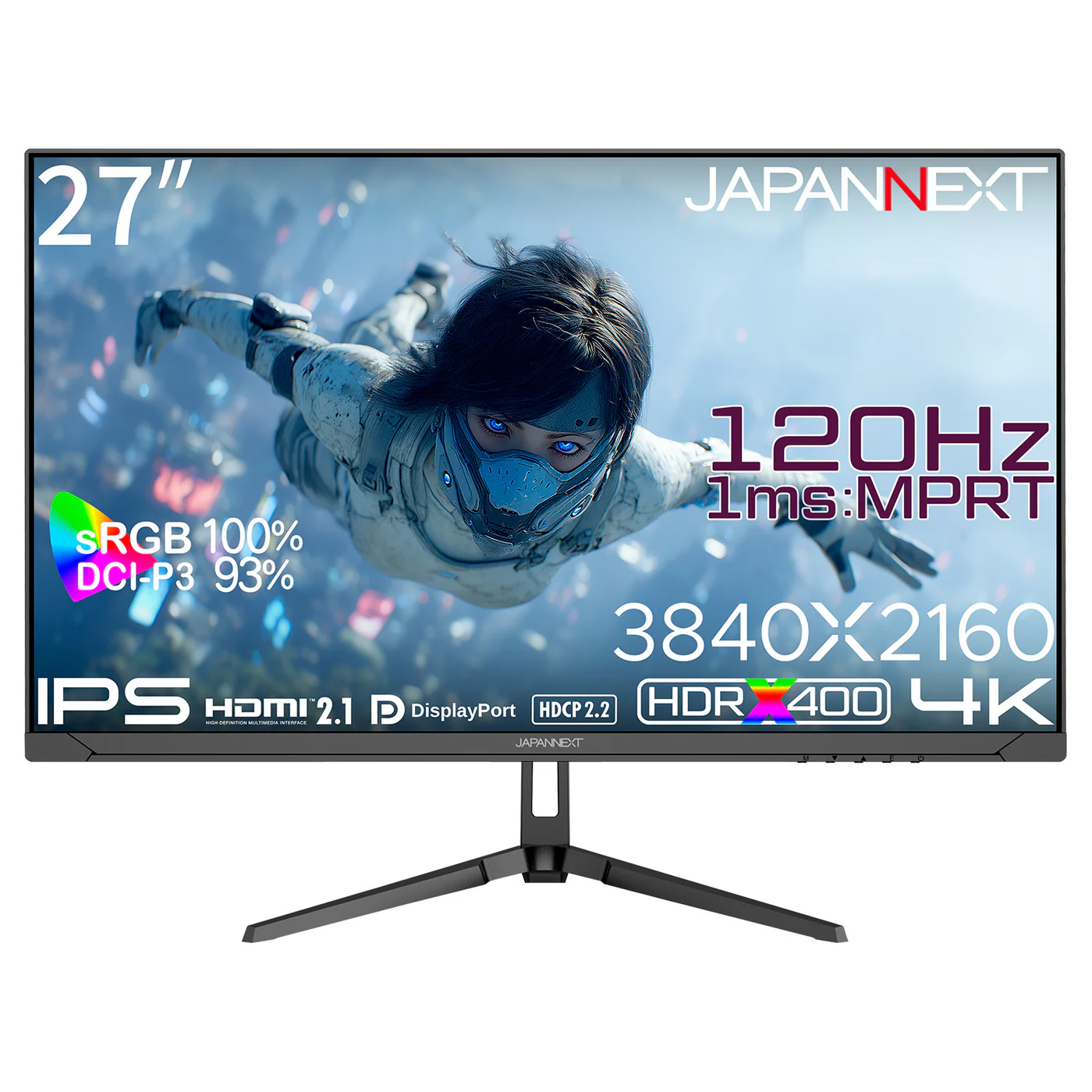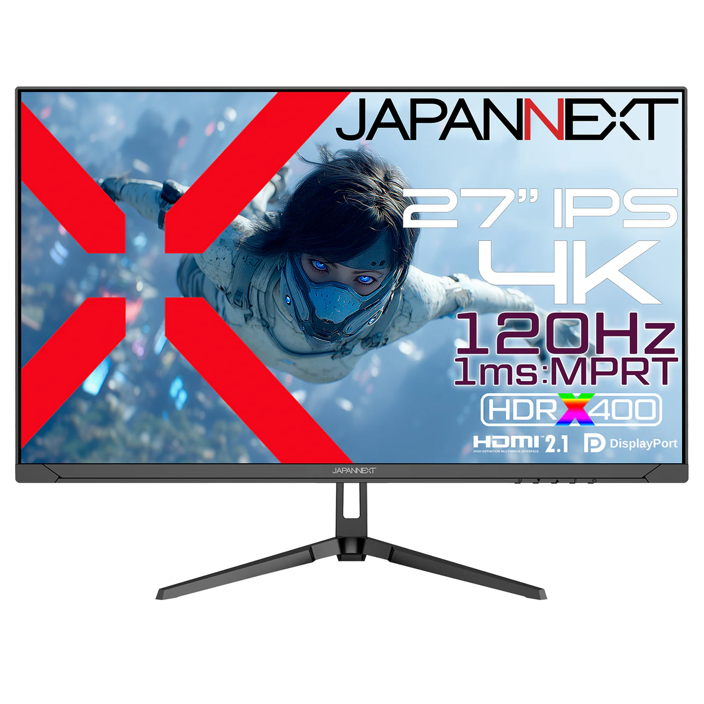 JAPANNEXT「JN-i27G120U」は、4K(3840×2160)解像度と120Hzリフレッシュレートを両立した、27インチのIPS系(AHVA)ゲーミングモニターです。