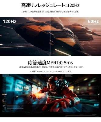 また、120Hzの高駆動やMPRT 0.5msといったゲーミング向けのスペックも備えつつ、sRGB 100%の色再現性やHDR10にも対応。