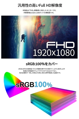 パネルは、IPS(HIS)を採用しており、色の再現性や視野角の広さが特徴です。sRGBカバー率は100%で、自然な色合いをしっかりと表示できます。