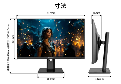 スタンド付きサイズは、幅542×高380~490×奥行192mm。