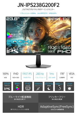 JAPANNEXT「JN-IPS238G200F2」は、23.8インチのフルHD解像度に加え、200Hzのリフレッシュレートと応答速度1ms(GTG、MPRT)を誇る、高速なゲーミングモニターです。