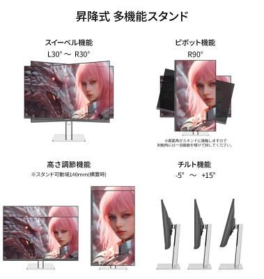 さらに、縦画面表示が可能なピボット機能を搭載。SNSの縦長コンテンツを表示したり、縦スクロールの多い作業を効率化したりと、ゲーム以外の用途でも役立ちます。