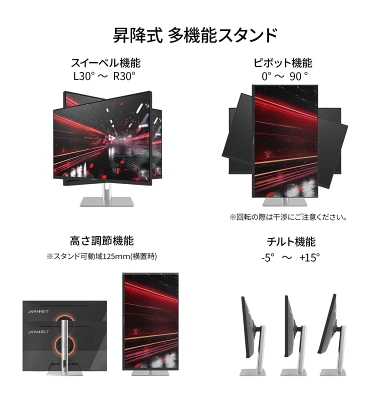 スタンドはチルト調整、スイーベル、最大125mmの高さ調整、さらにピボット機能まで搭載。縦置きも可能で、動画視聴からプログラミング作業まで幅広く活用できます。
