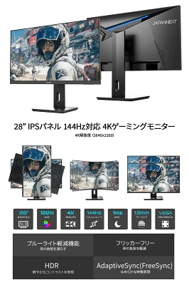 「JN-IPS28G144U-HSPC6」は、28インチの4K(3840×2160)解像度と144Hzの高リフレッシュレートを両立した、ハイスペックなゲーミングモニターです。