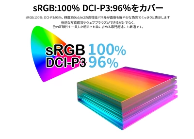 sRGB 100%+DCI-P3 96%の広色域対応で、映像や写真の編集作業も快適。HDR10対応により、映画や動画視聴でも臨場感ある映像を楽しめます。