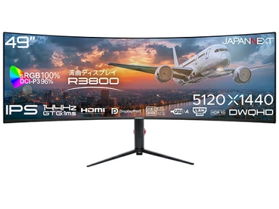 「JN-IPS49G144DQ-HSC6-L」は、49インチという圧倒的なサイズに加え、R3800のカーブを採用した湾曲ウルトラワイドモニターです。