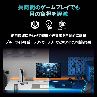 さらに、フリッカーフリーとブルーライト軽減機能を組み合わせることで、目の負担や不快感を軽減。