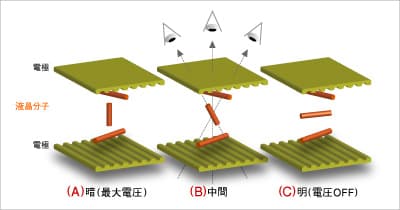 電圧をかけないときは、液晶分子が「ねじれた状態」で光が通過。逆に電圧をかけると、液晶分子が垂直になっていくため、光が遮断されて暗くなるという構造です。