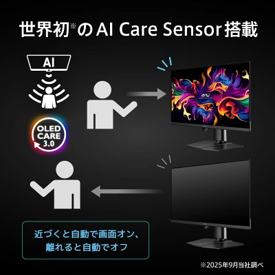 本製品は、ゲームに没頭するプレイヤーの健康面も配慮しています。搭載されている「AI Care Sensor」は、人の存在を検知し、自動で画面の明るさ調整や消灯を行う機能。