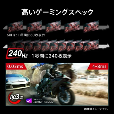 他の追随を許さない衝撃的なビジュアル表現に加え、0.03ms応答速度、240Hzリフレッシュレートでゲーミング性能も強烈。
