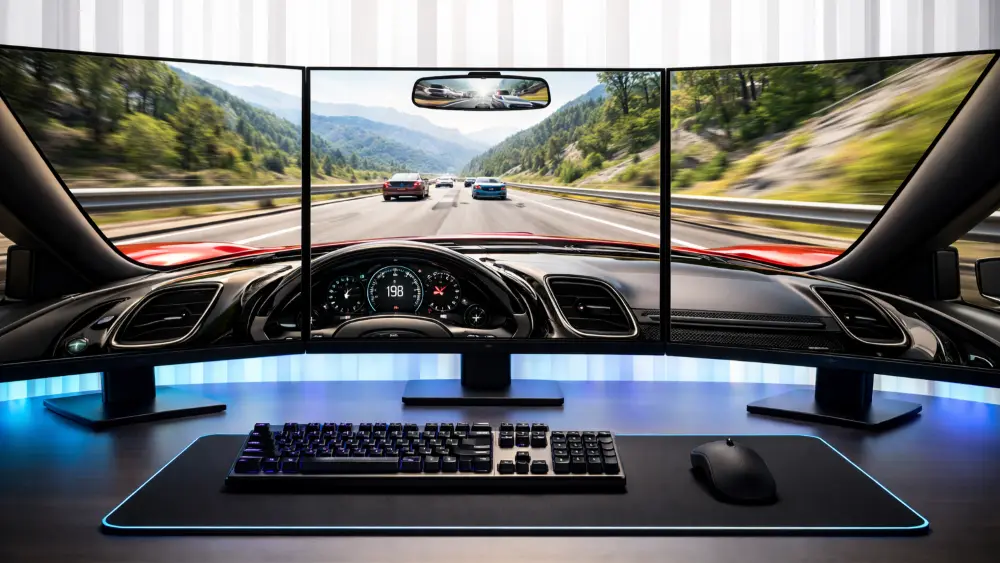 まずは、3画面全体に1つの映像を表示する使い方です。巨大なスクリーンが目の前に広がるので、迫力満点のゲームや動画を楽しめます。