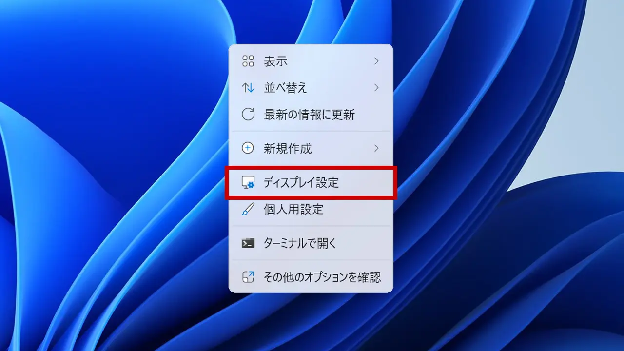 ①まず、デスクトップ画面の何もないところで右クリックして、ディスプレイ設定を呼び出しましょう。