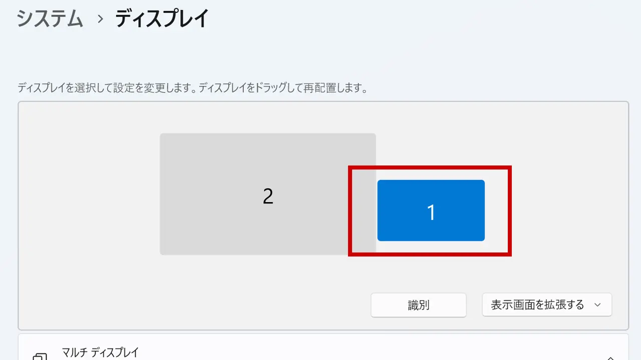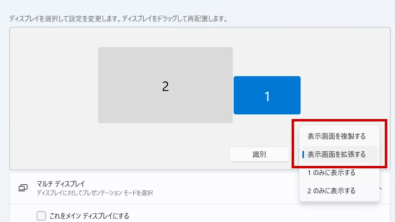 ③識別ボタンの右側には、マルチディスプレイの使い方を選択する項目があるのでクリックします。