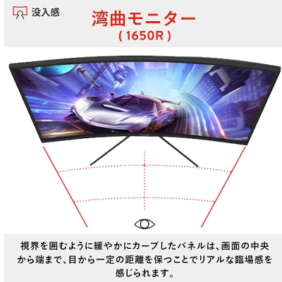 最大の特徴といえるのが、湾曲率1650Rのカーブディスプレイ。平面モニターに比べて視線の移動が少なく、自然に画面全体を捉えることができます。