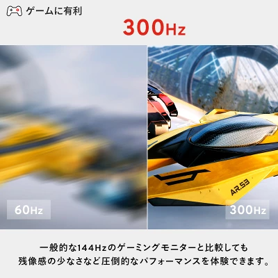 1秒間に300回の映像更新を行えるため、動きの速いアクションやFPSタイトルでも残像を極限まで抑え、非常に滑らかな映像を体感できます。