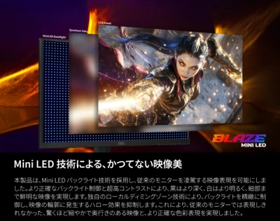 「Q27G4ZMN/11」は、27インチのWQHD解像度を持つゲーミングモニターで、最大の特徴はMini-LEDとQuantum Dot(量子ドット)技術を組み合わせた先進のディスプレイです。
