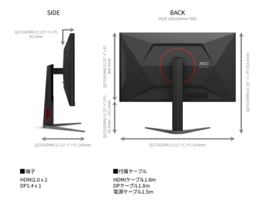 | 主な付属品 | 電源ケーブル1.5m、HDMIケーブル1.8m Displayportケーブル1.8m、スタンド ベース、保証書、ケーブル付属リスト |
