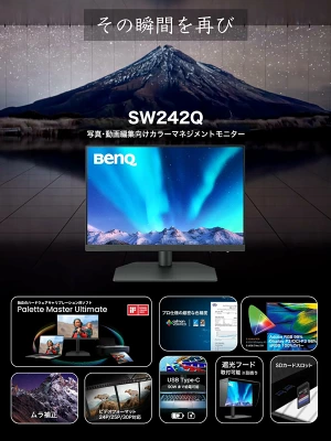 BenQ「SW242Q」は、WQXGA解像度・広色域・色精度の三拍子が揃った、まさにプロフェッショナル仕様のモニターです。