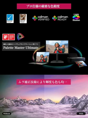 SW242Qは工場出荷時に個別キャリブレーションが施されており、Delta E(色差)平均値が1.5以下という高い色精度を確保。