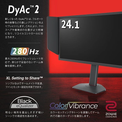 24.5型から24.1型へ変更された画面には、高速のFast TNパネルを採用。残像低減機能のDyAc 2で、高レベルの視認性を誇り、速いゲームで優位に立つことが可能です。