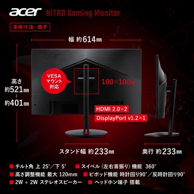 「XV271Zbmiiprx」は、最大280Hzのリフレッシュレートと0.5msの応答速度に対応した、27インチの高速ゲーミングモニターです。